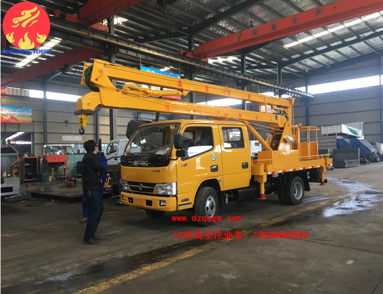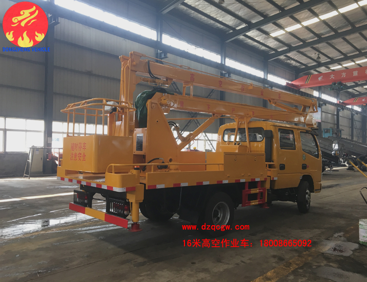 我公司國五東風小多利卡雙排高空作業車,16米高空作業車整車型號SZD5060JGK5型高空作業車,外形尺寸:7650 x 2000 x 3100(mm),軸距3308(mm),發動機可選玉柴、輕發、全柴柴油發動機,115馬力。此款車型加裝液壓無極調速,整車的穩定性及安全性更高,操作更平穩。安裝四支液壓支腿,帶吊鉤,吊鉤吊1噸;上下均帶操作系統,選裝電控。