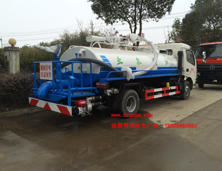 底盤說明:新款單排可前翻白色駕駛室,東風5檔變速箱,汽剎制動,帶原裝方向助力,中冷增壓,7.50R16原廠鋼絲胎.朝柴120馬力柴油發動機,192車架,軸距3800mm,2.5噸前橋,4.5噸后橋。罐體有效容積:5.5立方。 專用部分:標配取力器、隨州真空吸糞泵(8mm以上建議加裝雙聯真空泵)、油水分離器、四通閥、洗手裝置、罐體后封頭閘閥控制自流口1個、糞罐、帶視糞窗1個、1根6米吸糞管、普通油漆。 吸糞管 : 可360度旋轉,抽滿糞罐時間:≤5min,吸程:≥6m。自吸自排,壽命長,工作速度快,容量大,運輸方便,適用于收集運輸糞便、泥漿、原油等液體物質。P.S. 可根據客戶要求加裝灑水功能,水罐糞罐獨立分倉,即可吸糞又可灑水,一車兩用。加裝水箱或工具箱,加裝液位報警裝置。 |